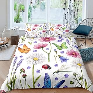 Castle Fairy カラフルな花 昆虫パターン 寝具カバー フルホワイト ピンク 花 掛け布団セット テントウムシ 蝶 トンボ 3ピース 掛け布団セット(1 デュベカバー 2 枕カバー)