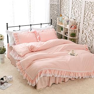 姫系 可愛いピンクの布団カバー ダブル ホワイトフリルレース付き 枕カバー2枚