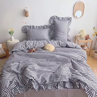 ギンガムチェック柄寝具カバー 綿100% フリルの掛け布団カバー シングル・枕カバー2枚