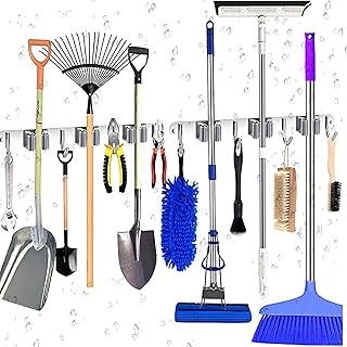 ほうきとモップホルダー 2パック 壁取り付け ガレージオーガナイザー ストレージツールラック 高耐久 ステンレススチール モップホルダー フック4個 クリップ3個 洗濯室/庭/ガレージ/クローゼット/キッチン用ツール14個収納