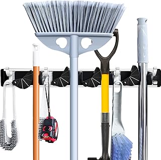 MENXEN モップとほうきホルダー 壁取り付け ガーデンツールオーガナイザー ホーム整理ラック ガレージオーガナイザー 5つのポジション フック6個付き (グレー)