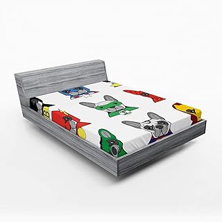 Ambesonne スーパーヒーロー ボックスシーツ ブルドッグ スーパーヒーロー 楽しい漫画の子犬 コスチュームドッグプリント ソフト装飾ファブリック 寝具 オールラウンドゴムポケット フルサイズ ホワイトグリーン