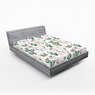 Ambesonne サボテンフィットシート ホット南砂漠植物 サボテンパターン キャメル アニマル モダンカラーイメージプリント ソフト装飾ファブリック寝具 オールラウンドゴムポケット フルサイズ グリーンホワイト