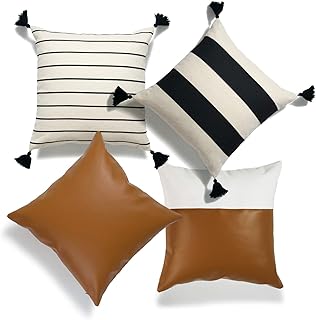 Kiuree ボーホー スローピローカバー 6枚セット 厚手 コットンリネン モダン マッドクロス ファームハウス デコレーション ストライプ フェイクレザー 枕カバー 18x18インチ カウチソファ用
