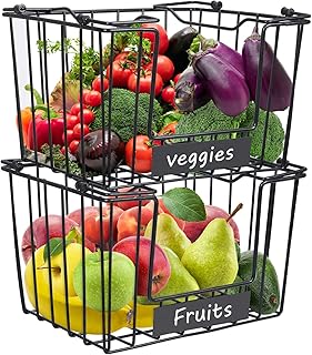 ホームスタッキングワイヤーマーケットバスケット チョークラベル付き 2個セット フルーツ野菜 野菜 金属製 収納容器 バスケットラック スタンド キッチン カウンター パントリー キャビネット バスルーム 棚 オーガナイザー ホルダー